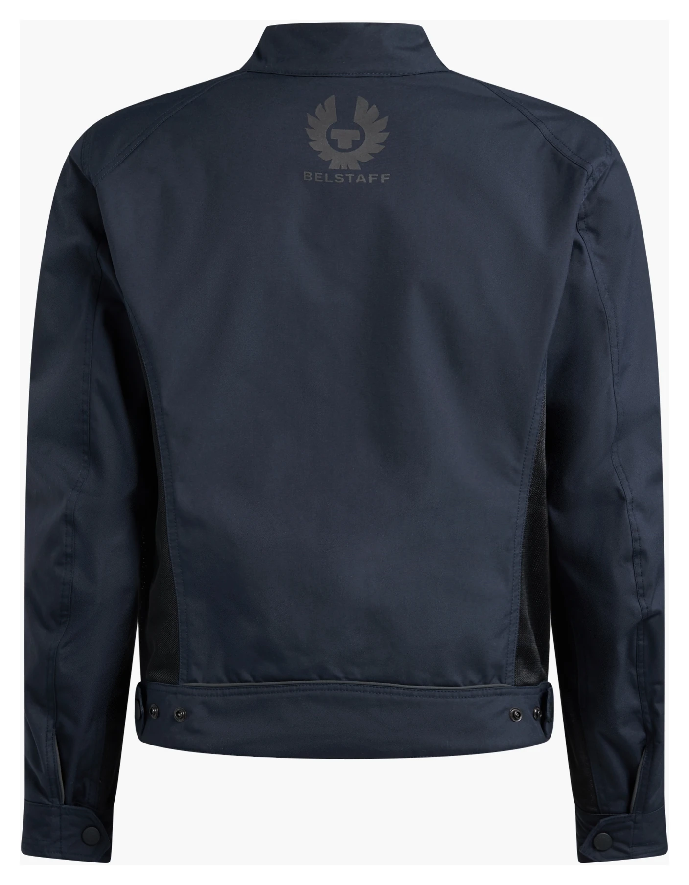 The Belstaff Temple Jacket is a no-frills summer jacket constructed of technical nylon and mesh meant to provide comfort and protection in hotter temperatures. The jacket features mesh inserts at the sleeves for airflow, removable CE armor at the shoulders and elbows and includes a pocket for an optional back protector (sold separately). The main zipper is covered on both ends with snapped closures using rubberized snaps.