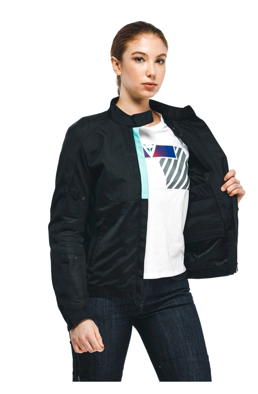 The women’s Risoluta Air Tex motorcycle jacket is a versatile, all-season garment that combines protection and ease of use. Constructed in resistant, anti-abrasion fabric, it allows for safe, comfortable riding even in summer, due to its excellent breathability. The removable thermal lining ensures peace of mind on the coldest of days, providing the ideal level of insulation with which to enjoy the road in confidence. Dainese safety standards are upheld with composite protectors on the shoulders and elbows, which can be removed if necessary. A dedicated pocket allows for the insertion of a G1 or G2 back protector.