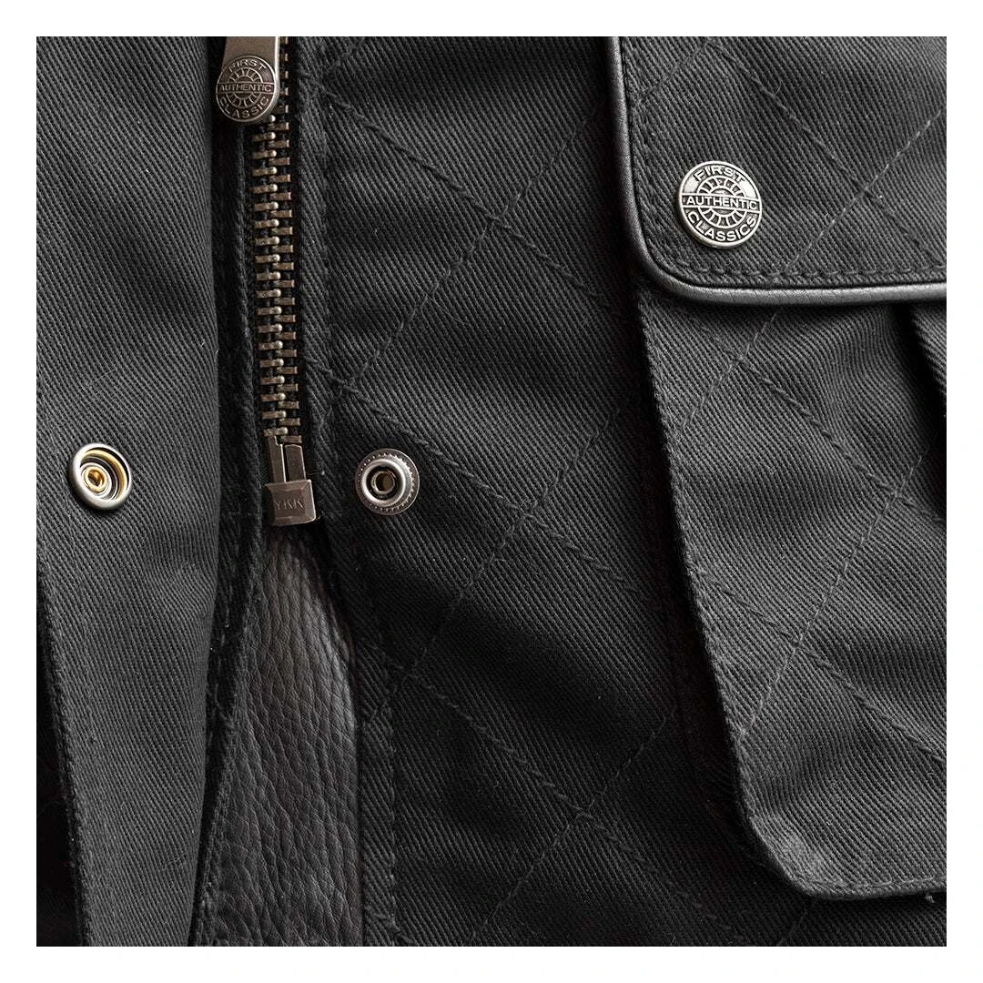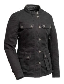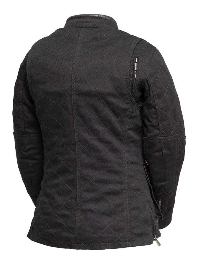 Introducing the Outcast utility style jacket, a perfect fit for any motorcycle enthusiast. This classic jacket is meticulously crafted from soft twill, featuring eye-catching diamond stitching. With four utility pockets on the front, a covered, cropped zipper with visible snaps, and a comfortable leather collar feature, it blends style and function seamlessly.
