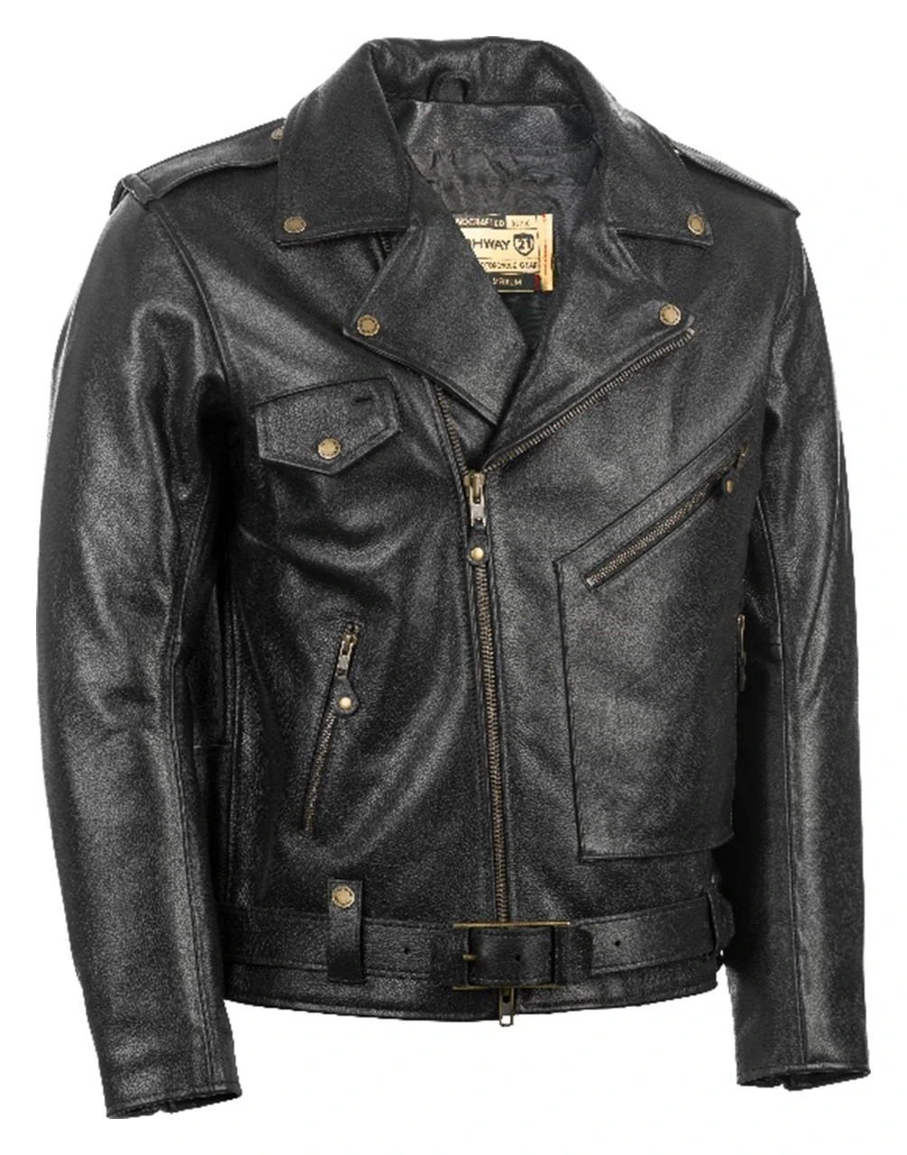 The Highway 21 Murtaugh Jacket combines classic styling with traditional function for the 21st century rider. The jacket is constructed from premium cow hide leather and features gusseted shoulders, aged brass hardware and pockets for optional armor (sold separately).