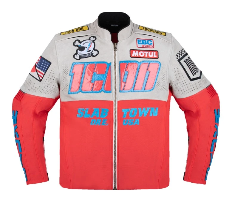 The limited-edition Icon Slabtown Intercept 84 Jacket merges vintage moto style with modern protection, featuring durable 1.2-1.4mm suede leather adorned with custom ICON graphics. Its chassis combines suede leather with 450D nylon stretch panels for flexibility, while 300D polyester reinforcements offer added durability. Designed for comfort and airflow, it has pre-curved arms, adjustable waist, an AirFly front mesh panel, zippered vents and a removable thermal vest liner for versatile, all-weather riding.