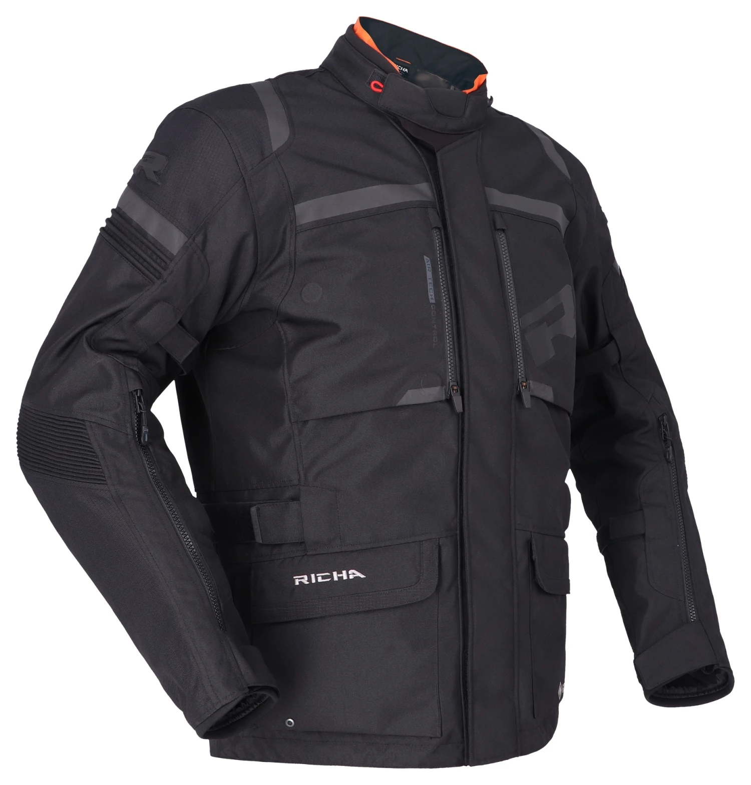 The RICHA Brutus GTX Jacket is made from Cordura 600D oxford fabric combined with ripstop panels and features a removable Gore Tex liner that can be worn both inside and outside of the jacket. D3O Level 1 protection at shoulders and elbows and built in pocket for a back protector (sold separately) provide full coverage to riders. Plenty of outside and inside pockets help secure valuables on longer rides. Adjustable sleeves and elastic cord at bottom seal out weather.