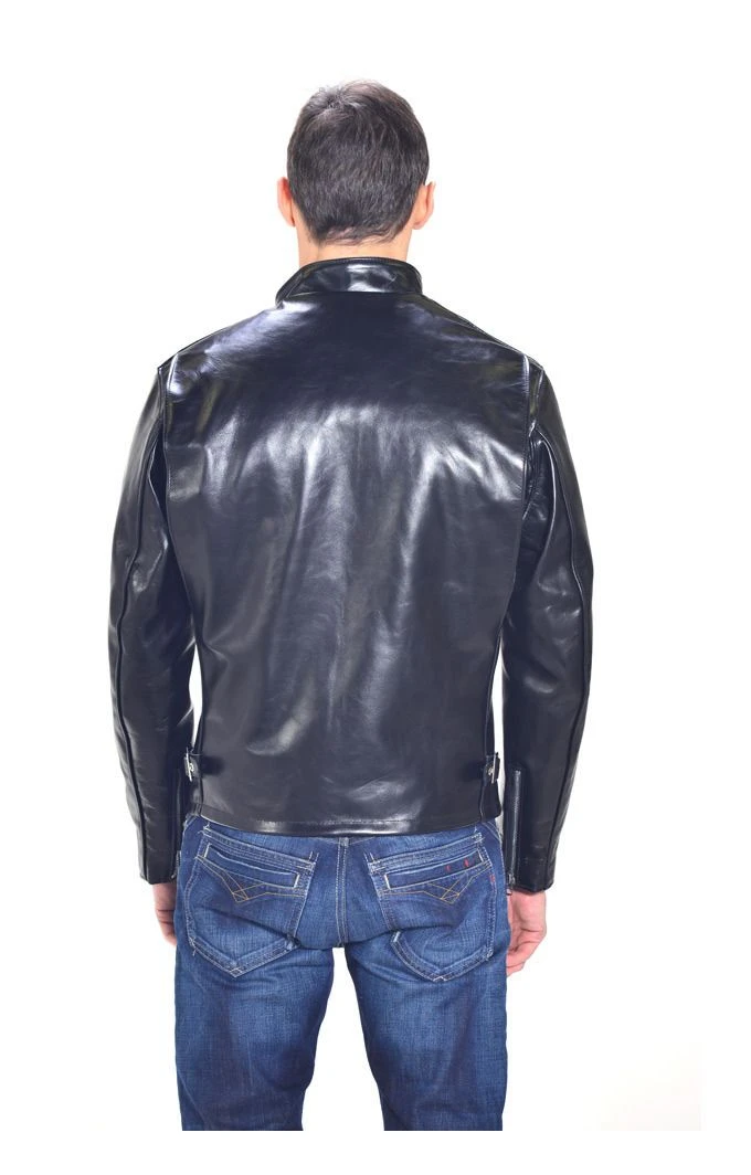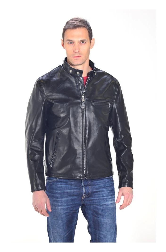 The most popular silhouette Schott offers, the 641 Jacket features a bi-swing back, adjustable stand-up collar and underarm gussets. The zippered chest and hand warmer pockets and fixed quilted liner are meant to keep the wind out and maximize range of temperature control. Constructed from deluxe, heavy horse hide for durability.